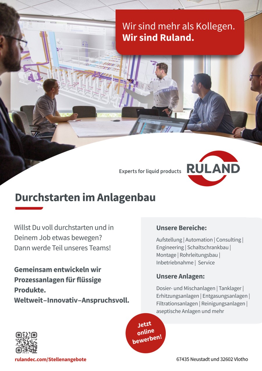 Ruland Engineering & Consulting GmbH in 500 Zeichen Ruland ist ein inhabergeführter Engineering-Experte mit rund 320 Mitarbeitenden und spezialisiert auf Prozessanlagen für Flüssigprodukte. Von der Beratung über das Engineering bis hin zum Bau einer kompletten vollautomatisierten Produktionsstätte bieten wir alle Leistungen aus einer Hand. Wir bauen auf langfristige Partnerschaften mit unseren Kunden, unseren Lieferanten, Dienstleistern und vor allem Mitarbeitern.