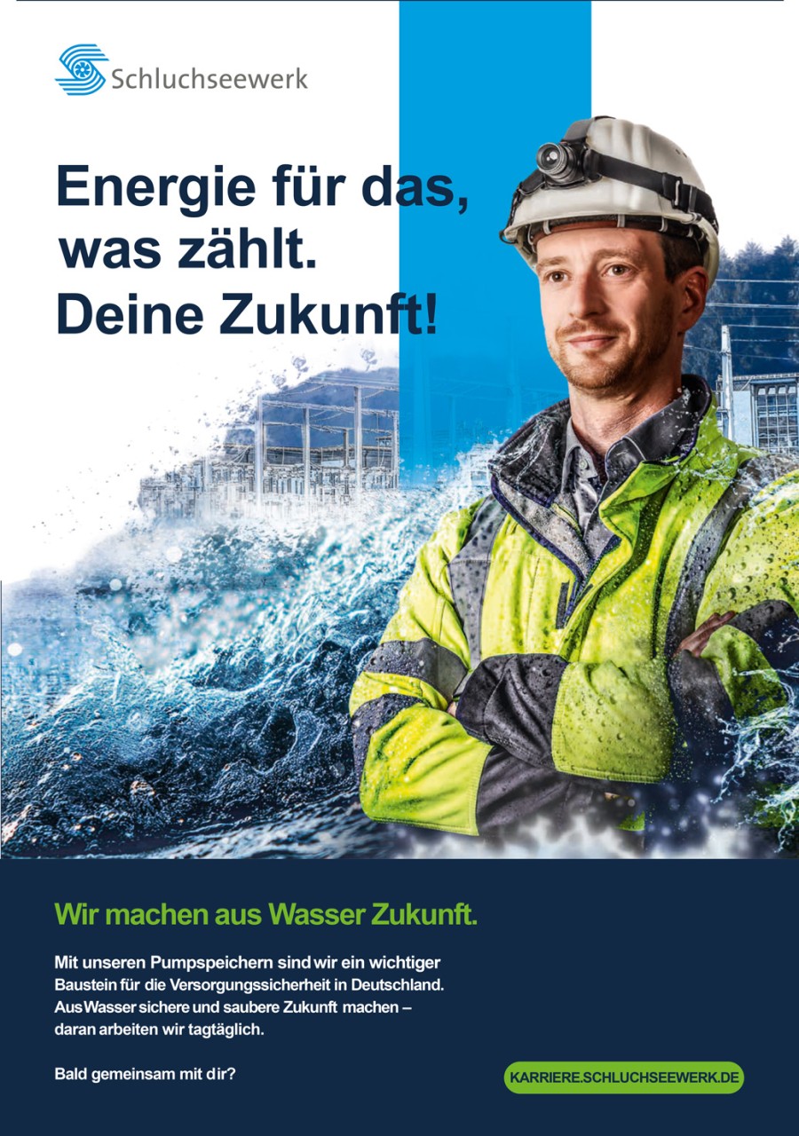 Die Schluchseewerk AG zählt zu den führenden Betreibern von Pumpspeicheranlagen. Deshalb sind Fachkompetenz, Wissen, Können und Tun das Fundament ihrer Unternehmenskultur. Fairness gegenüber ihren Mitarbeitenden und den Menschen in der Region, in der sie agiert, sind selbstverständlich. Umweltbewusstsein, Natur- und Artenschutz sowie Ressourcenschonung lebt das Unternehmen von Anbeginn ihres Wirkens im Bereich erneuerbarer Energien.