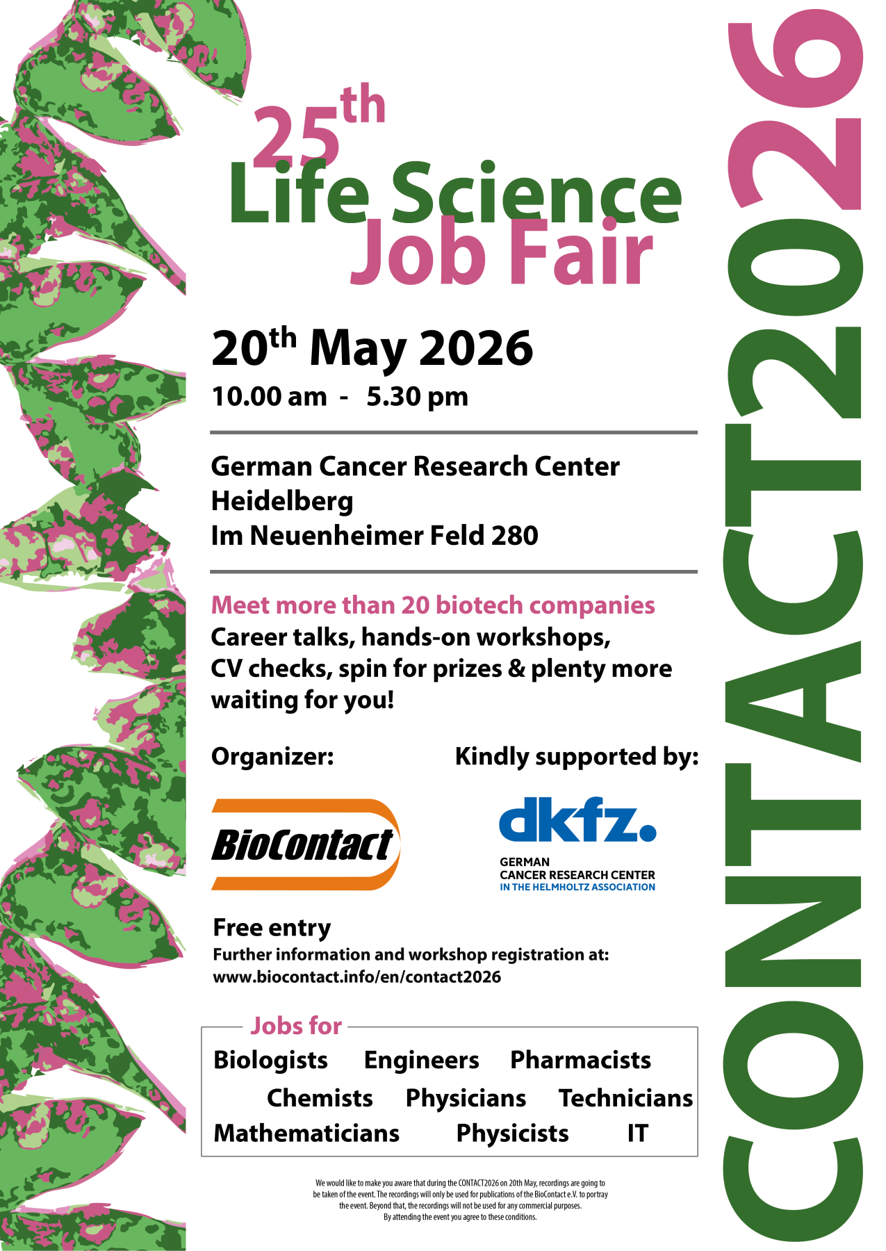CONTACT2026 is the premier job fair for the life sciences in the Rhine-Neckar region and the recruiting event of the year. This is an excellent opportunity for students, graduates, and experienced professionals to establish valuable connections and to prepare effectively for the job application process. Admission to the fair, including all talks and workshops, is free of charge. For more information, please visit the event website (https://www.biocontact.info/contact2026) and follow BioContact e.V. on LinkedIn and Instagram.