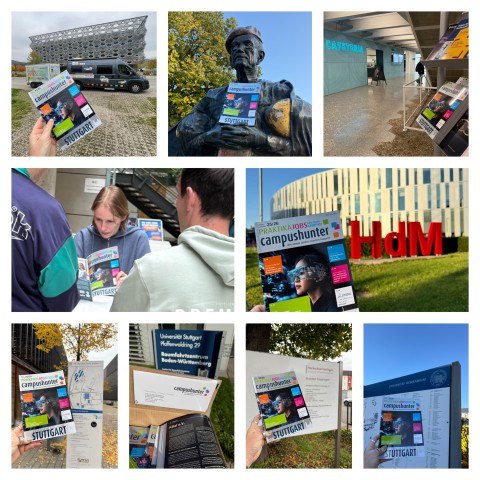 Wir waren bis Wochenmitte in Stuttgart und Umgebung unterwegs und haben die Hochschulen in Reutlingen, Tübingen, Göppingen, Nürtingen, Esslingen, Hohenheim, Stuttgart sowie Aalen mit der neuen campushunter-Ausgabe Stuttgart** bestückt.